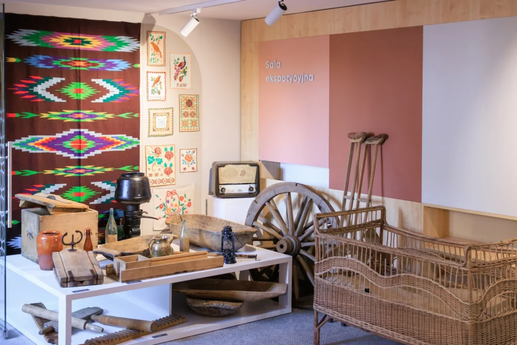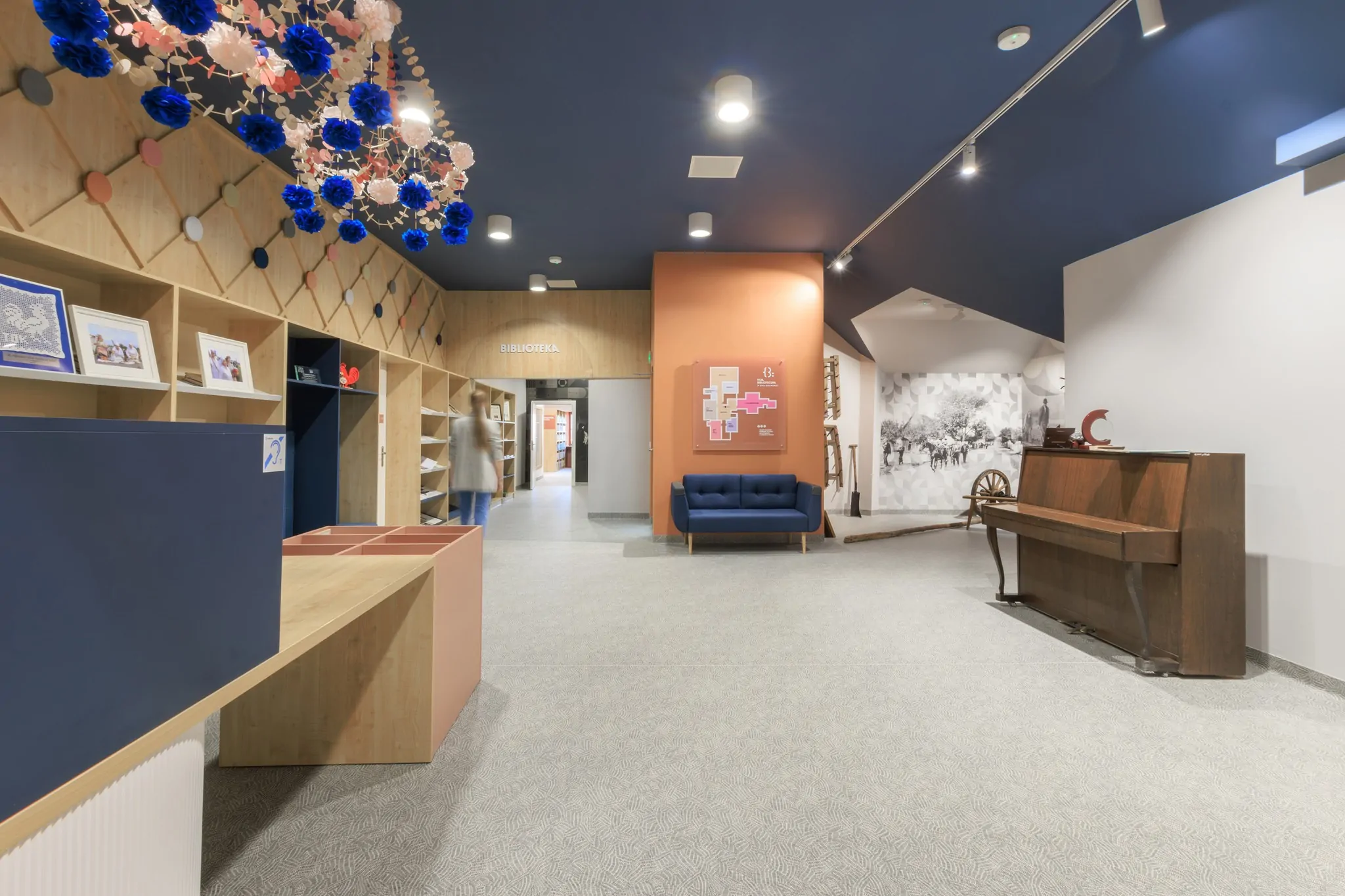 Jednym z najbardziej wyjątkowych elementów są tradycyjne pająki ludowe zdobiące wnętrze. Ręcznie wykonane przez KGW Radawczanki dodają bibliotece niepowtarzalnego klimatu, łącząc historię z nowoczesnością.🎨✨